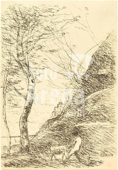 alb3713490 Shepherd Struggling with a Goat (Berger luttant avec sa chevre). Dated: 1874. Medium: cliche-verre. Museum: National Gallery of Art, Washington DC. Author: Jean-Baptiste Camille Corot.