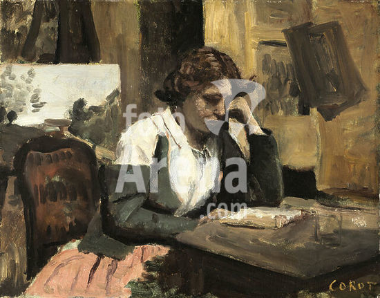 alb3733963 Young Girl Reading. Dated: c. 1868. Dimensions: overall: 32.5 x 41.3 cm (12 13/16 x 16 1/4 in.) framed: 50.5 x 59.1 x 6.4 cm (19 7/8 x 23 1/4 x 2 1/2 in.). Medium: oil on paperboard on wood. Museum: National Gallery of Art, Washington DC. Author: Jean-Baptiste Camille Corot.