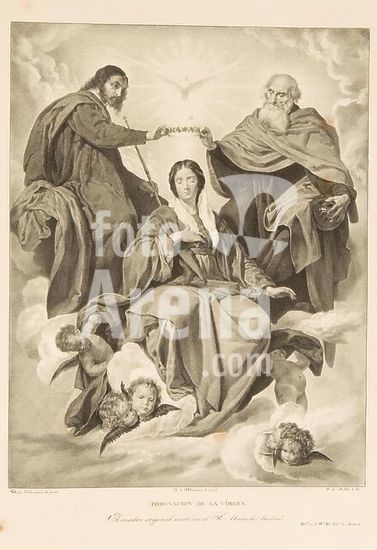 alb3787772 Pierre Jacques Feillet (Lithographer) (After Velázquez, Diego Rodríguez de Silva y); José de Madrazo y Agudo (Director); Real Establecimiento Litográfico de Madrid (Printer) / 'The Coronation of the Virgin'. 1832 - 1836. Lithographic aquatint, Crayon lithography, Printing on japon, Scraper on wove paper; 1832 - 1836. Lithographic aquatint, Crayon lithography, Printing on japon, Scraper on wove paper. Museum: Museo del Prado, Madrid, España.