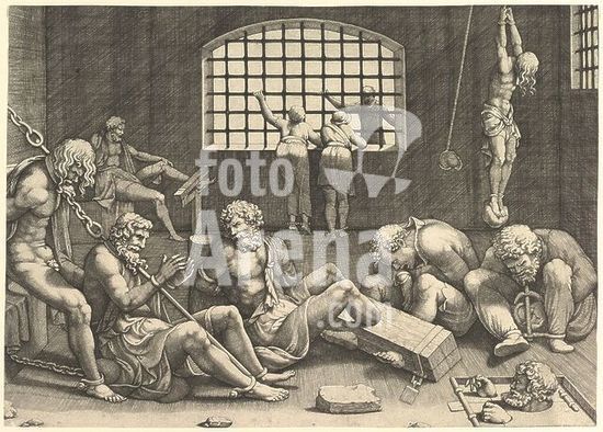 alb3618620 The Prison; a group of men in a dungeon bound in chains and shackles; to the right a figure hanging from his arms, tied to a boulder. Artist: Anonymous; After Giulio Romano (Italian, Rome 1499?-1546 Mantua). Dimensions: plate: 10 1/4 x 14 3/16 in. (26 x 36 cm) trimmed within borderline. Former Attribution: Formerly attributed to Giorgio Ghisi (Italian, Mantua ca. 1520-1582 Mantua). Date: n.d.. Museum: Metropolitan Museum of Art, New York, USA.