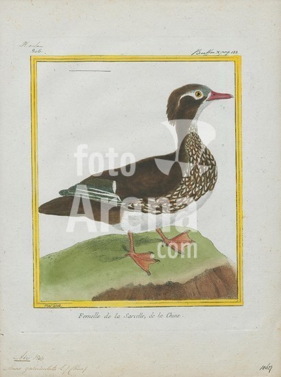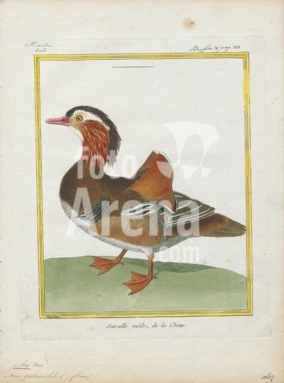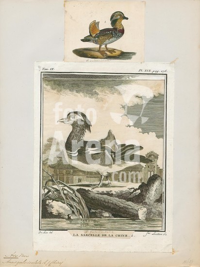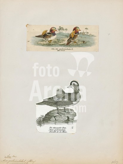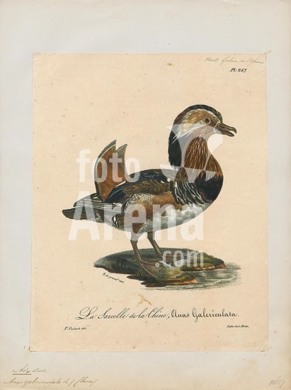 alb4349681 Aix galericulata, Print, The mandarin duck (Aix galericulata) is a perching duck species native to East Asia. It is medium-sized, at 41–49 cm (16–19 in) long with a 65–75 cm (26–30 in) wingspan. It is closely related to the North American wood duck, the only other member of the genus Aix. Aix is an Ancient Greek word which was used by Aristotle to refer to an unknown diving bird, and galericulata is the Latin for a wig, derived from galerum, a cap or bonnet., 1700-1880.