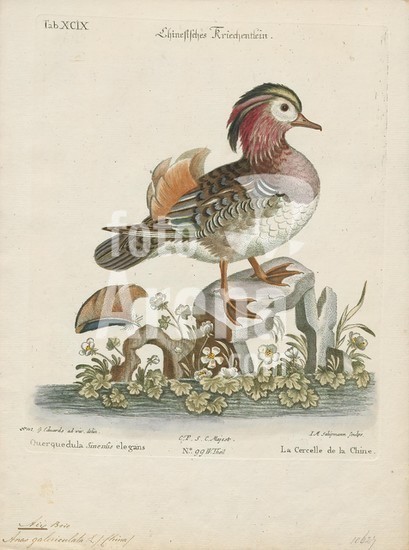 alb4333950 Aix galericulata, Print, The mandarin duck (Aix galericulata) is a perching duck species native to East Asia. It is medium-sized, at 41–49 cm (16–19 in) long with a 65–75 cm (26–30 in) wingspan. It is closely related to the North American wood duck, the only other member of the genus Aix. Aix is an Ancient Greek word which was used by Aristotle to refer to an unknown diving bird, and galericulata is the Latin for a wig, derived from galerum, a cap or bonnet., 1700-1880.