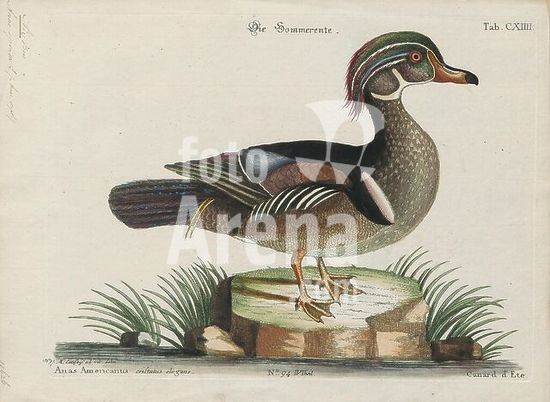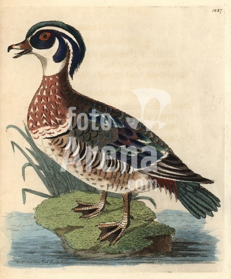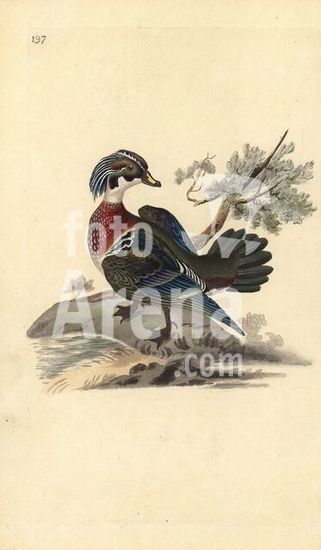 alb2031875 American wood duck, Aix sponsa. Handcoloured copperplate drawn and engraved by Edward Donovan from his own "Natural History of British Birds," London, 1794-1819. Edward Donovan (1768-1837) was an Anglo-Irish amateur zoologist, writer, artist and engraver. He wrote and illustrated a series of volumes on birds, fish, shells and insects, opened his own museum of natural history in London, but later he fell on hard times and died penniless.