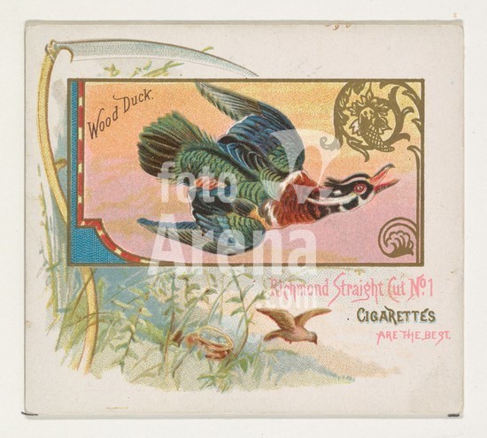 alb3638755 Wood Duck, from the Game Birds series (N40) for Allen & Ginter Cigarettes. Dimensions: Sheet: 2 7/8 x 3 1/4 in. (7.3 x 8.3 cm). Publisher: Issued by Allen & Ginter (American, Richmond, Virginia). Date: 1888-90.Trade cards from the "Game Birds" series (N40), issued in 1888-90 in a set of 50 cards to promote Allen & Ginter brand cigarettes. Series N40 reproduces the cards from N13 in a larger size. Museum: Metropolitan Museum of Art, New York, USA.