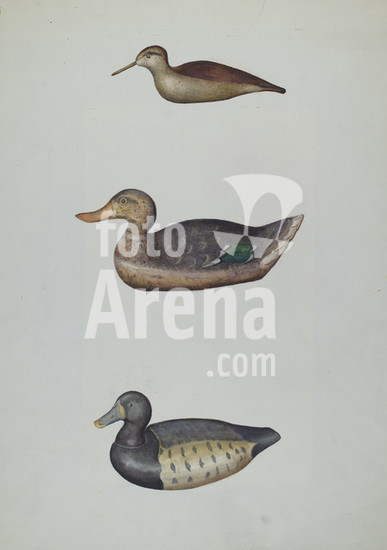 alb3742896 Three Decoy Ducks. Dated: c. 1937. Dimensions: overall: 50 x 39 cm (19 11/16 x 15 3/8 in.). Medium: watercolor, graphite, and colored pencil on paperboard. Museum: National Gallery of Art, Washington DC. Author: Harriette Gale.