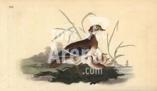alb2032566 American wood duck (female and young), Aix sponsa. Handcoloured copperplate drawn and engraved by Edward Donovan from his own "Natural History of British Birds," London, 1794-1819. Edward Donovan (1768-1837) was an Anglo-Irish amateur zoologist, writer, artist and engraver. He wrote and illustrated a series of volumes on birds, fish, shells and insects, opened his own museum of natural history in London, but later he fell on hard times and died penniless.