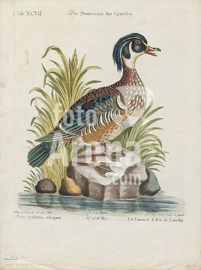 alb4332267 Aix sponsa, Print, The wood duck or Carolina duck (Aix sponsa) is a species of perching duck found in North America. It is one of the most colorful North American waterfowl., 1700-1880.