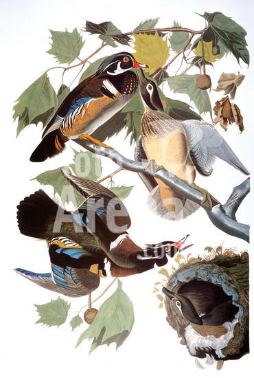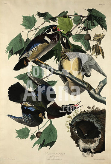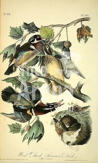 alb3701075 Summer or Wood Duck. Dated: 1834. Dimensions: plate: 97.2 x 65.4 cm (38 1/4 x 25 3/4 in.) sheet: 101 x 67.6 cm (39 3/4 x 26 5/8 in.). Medium: hand-colored etching and aquatint on Whatman paper. Museum: National Gallery of Art, Washington DC. Author: Robert Havell after John James Audubon.