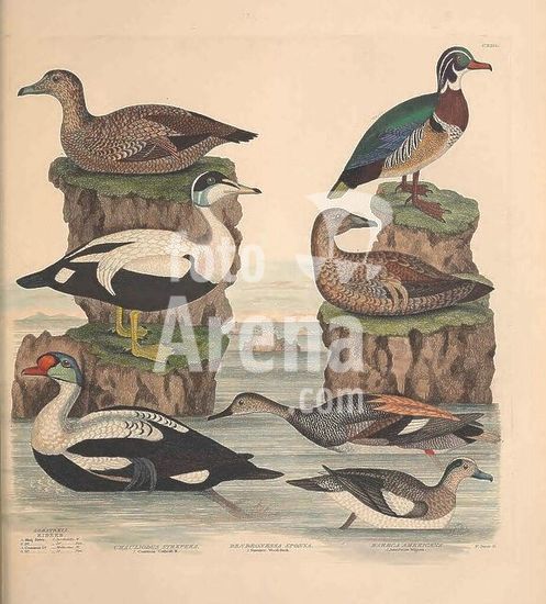 alb15256782 Illustrations of the American ornithology of Alexander Wilson and Charles Lucien Bonaparte, Edinburgh, Frazer & Co, 1835, birds, North America, pictorial works, United States, A collection of various waterfowl is depicted, showcasing a variety of species that inhabit wetland environments. The scene features elegant birds perched on rocky outcrops above a serene body of water. Prominent species include a vibrant wood duck with striking plumage, a graceful canvasback, a classic mallard with its distinctive green head, and other diverse ducks. Each bird displays unique colors and patterns, highlighting the beauty and diversity of avian life. The tranquil setting underscores the natural habitat these ducks thrive in, with soft vegetation and gentle water ripples complementing their presence.