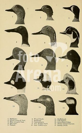 alb15274746 Handbook of birds of eastern North America, 1898. birds, North America, Aythya americana, Anas clypeata, Oxyura jamaicensis, Aythya valisineria, Anas americana, Bucephala clangula, Aythya affinis, Clangula hyemalis, Somateria mollissima, Aix sponsa, Anas acuta, Anas carolinensis, Bucephala albeola, Anas discors, Melanitta fusca, A collection of detailed illustrations showcasing various species of ducks, each presented in a side profile view. The arrangement features 15 distinct duck species, numbered for identification. The species include, but are not limited to, the Mallard, American Black Duck, Wood Duck, and Bufflehead, among others. Each illustration captures unique characteristics such as bill shape, neck length, and head markings, emphasizing the diversity in size and form among these waterfowl. Accompanying each illustration is a corresponding number for reference, indicating their identification in a key located below.