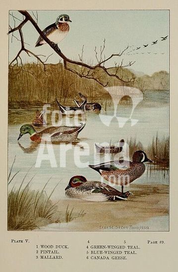alb15280138 Bird-life, a guide to the study of our common birds, New York, Appleton, 1900, birds, pictorial works, United States, American, Museum, Natural, History, Teal, Duck, Pintail, Mallard, Goose, This artwork features a serene natural setting with various waterfowl. In the foreground, a group of teal ducks are observed along the water's edge, showcasing their distinctive plumage. Among them are a wood duck with its strikingly colorful feathers, a pintail exhibiting its elegant shape, and a mallard displaying its familiar green head. In the background, more teal can be seen, along with Canada geese resting by the shoreline. The composition highlights the tranquil beauty of avian life in a wetland environment, emphasizing the diversity of species present.