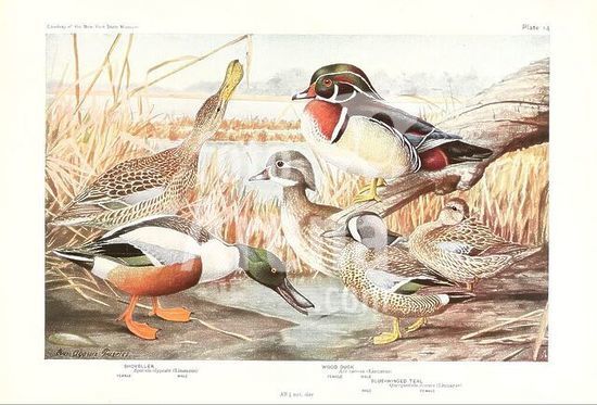 alb15288937 Birds of America v.1. New York, The University Society, 1923. birds, North America, 59827, Anas clypeata, Aix sponsa, Anas discors, Querquedula discors, Spatula clypeata, A vibrant depiction of various species of ducks gathered near a serene waterway, surrounded by lush grasses and reeds. The scene features a male wood duck, characterized by its striking plumage, prominently perched on a log. Nearby, a male mallard showcases its distinctive green head, while a female wood duck and a blue-winged teal add to the diversity of the gathering. Other ducks, including a shoveler and a pair of female ducks, are arranged harmoniously, presenting a lively tableau of waterfowl in their natural habitat. The attention to detail highlights the unique features and colors of each species, celebrating the beauty of avian life.