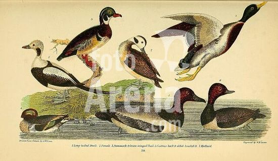 alb15338404 American Ornithology, or The Natural History of the Birds of the United States, Petter & Galpin [187-]. Birds, United States, Mallard, Anas platyrhynchos, Aythya americana, Redhead, Green-winged Teal, Aythya valisineria, Clangula hyemalis, Aix sponsa, Anas carolinensis, Wood Duck, Canvasback, Long-tailed Duck, A collection of various bird species appears in a beautifully illustrated arrangement. The artwork features several ducks, showcasing their distinct colors and markings. Prominent are the male and female representations of the species, with varied plumage hues that exhibit the differences between genders. Each bird is numbered, likely corresponding to a legend that identifies them. The natural setting includes grass and water, creating a harmonious backdrop for the vibrant creatures. This illustration captures the intricate details of their feathers and postures, reflecting the diversity among waterfowl.