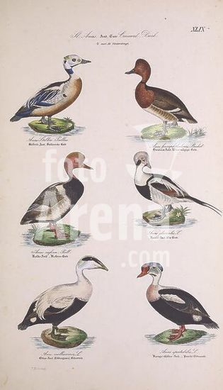 alb15382417 Skandinaviens fugle, Kjøbenhavn, L.A. Jørgensen, 1875-1879, birds, Denmark, Iceland, Greenland, Scandinavia, nettarufina, red-crested pochard, clangula hyemalis, somateria mollissima, common eider, long-tailed duck, aythya nyroca, ferruginous pochard, polysticta stelleri, Steller's eider, somateria spectabilis, king eider, This artwork features a collection of six distinct waterfowl, each depicted in detailed illustrations. 1. **Top Left**: A North American Wood Duck, known for its vibrant plumage and distinctive crest, is shown perched on a grassy area. 2. **Top Middle**: The Hooded Merganser displays its striking contrasting colors and unique crest, characterized by a rounded head with a fan-like display that captures attention. 3. **Top Right**: An American Black Duck, with its earthy tones and subtle iridescence, stands gracefully on a rock, showcasing its adaptability in various habitats. 4.