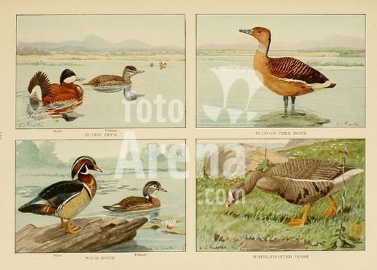 alb15402581 The book of birds, common birds of town and country, American game birds, Washington, D. C, 1918, birds, The illustration features four distinct species of waterfowl, each rendered with careful detail. In the top left corner, a male and female Ruddy Duck can be seen swimming closely together; the male displays its vibrant plumage while the female showcases more subdued tones. Adjacent to them, on the top right, is a Fulvous Tree Duck, recognized for its warm orange-brown feathers and elegant posture. The lower left section depicts a Wood Duck, noted for its striking coloration and intricate patterns, perched gracefully on a branch. Finally, the lower right presents a White-fronted Goose, characterized by its distinctive white facial markings and grassy habitat, completing this diverse collection of aquatic birds.