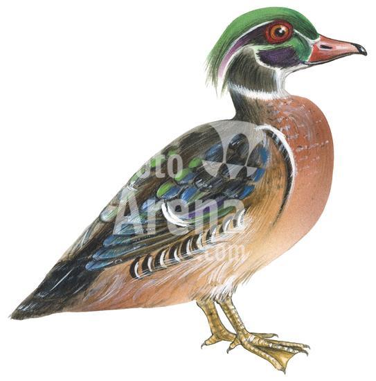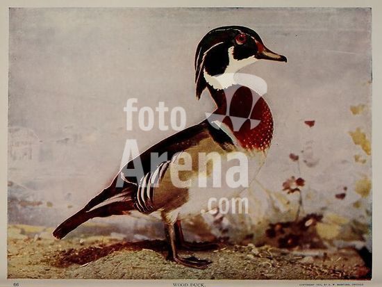 alb15406049 Birds and nature in natural colors, Chicago, A.W. Mumford, Publisher, 1913-1914, Birds, North America, Aix Sponsa, A beautifully detailed depiction of a wood duck, showcasing its distinctive plumage and elegant posture. The bird's iridescent feathers shimmer with hues of green, blue, and chestnut, while its striking facial markings display a vibrant contrast that captures attention. The wood duck stands poised, with one leg raised as if ready to take flight, against a soft, blurred background that hints at a natural setting. This representation highlights the bird's graceful form and unique coloration, emphasizing its status as a symbol of beauty in the avian world.