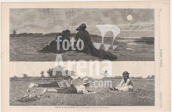 alb3646758 Flirting on the Sea-Shore and on the Meadow - Drawn by Winslow Homer (Harper's Weekly, Vol. XVIII). Artist: Winslow Homer (American, Boston, Massachusetts 1836-1910 Prouts Neck, Maine). Dimensions: image: 9 1/8 x 13 1/2 in. (23.2 x 34.3 cm)sheet: 10 7/16 x 15 7/8 in. (26.5 x 40.4 cm). Publisher: Harper's Weekly (American, 1857-1916). Date: September 19, 1874. Museum: Metropolitan Museum of Art, New York, USA.