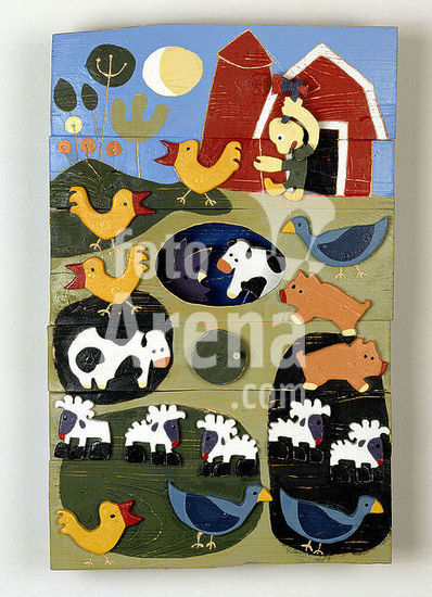 orz187334 VISITA A LA GRANJA - 2003 - ACRILICO/MADERA - 60x38x15. Author: ALEX MITCHELL. Location: FACTORIA DEL PERRO VERDE. MADRID. SPAIN.