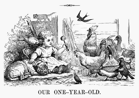 0093438 GIRL WITH BIRDS, 1873. /nA one year old girl in the family farmyard. Wood engraving, American, 1873.