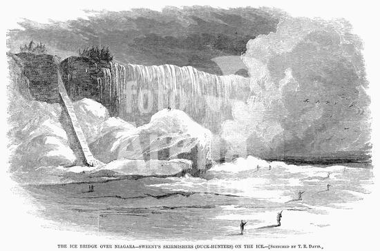 0096193 NIAGARA FALLS, 1866. /nDuck hunters on the ice bridge at Niagara Falls. Wood engraving, American, 1866.