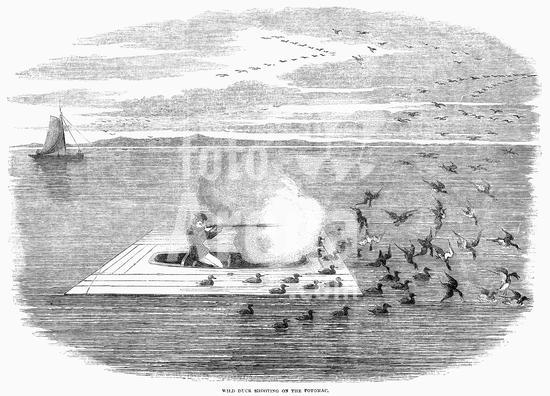 0096196 DUCK HUNTING, 1850. /nWild duck shooting on the Potomac. Wood engraving, English, 1850.