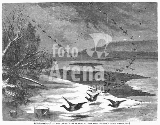 0096208 DUCK HUNTING, 1871. /nDuck shooting in winter. Wood engraving, American, 1871.