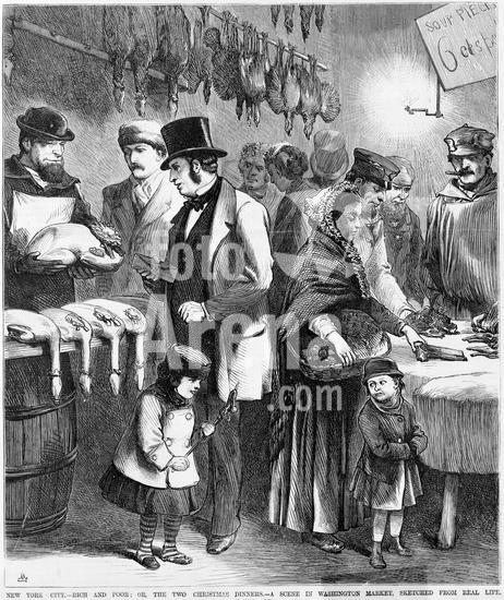 0106324 RICH AND POOR, 1873. /n'New York City - Rich and Poor; Or, The Two Christmas Dinners. A Scene in Washington Market, sketched from real life.' Wood engraving, American, 1873.