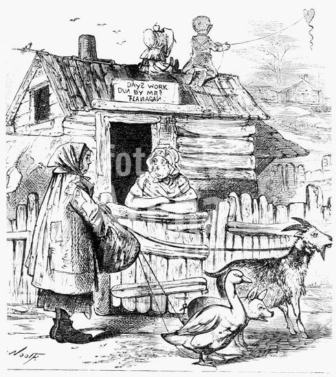 0117710 ANTI-IRISH CARTOON, 1874. /n'Days Work Dun by Mrs. Flanagan.' Racist anti-Irish cartoon. Wood engraving, American, 1874.