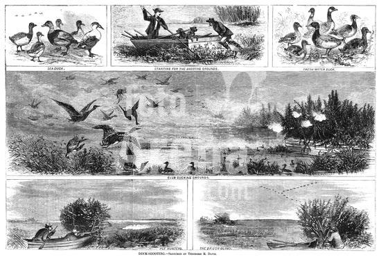0264599 DUCK HUNTING, 1868. Scenes of ducks and duck hunters. Wood engraving, American, 1868.