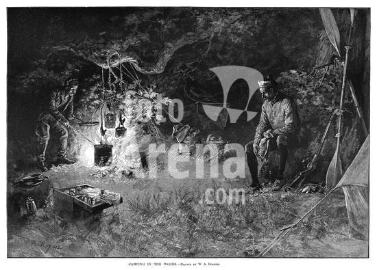 0264901 HUNTERS' CAMP, 1890. Two hunters camping in the woods. Engraving, American, 1890.