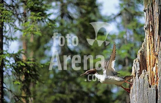 iblflp01350279 Goosander (Mergus merganser), adult female, flying from nest in tree, Finland, Europe