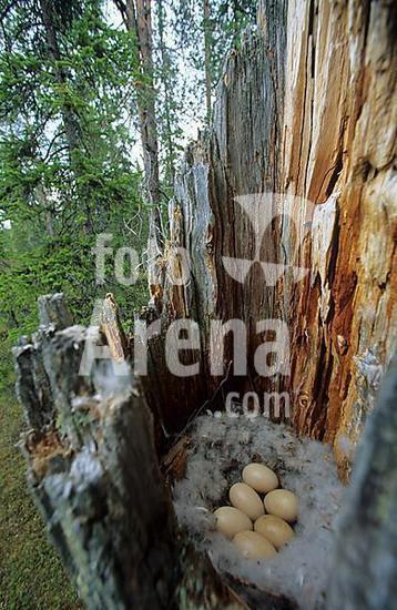 iblflp01350280 Goosander (Mergus merganser) nest containing six eggs in old tree, Finland, Europe