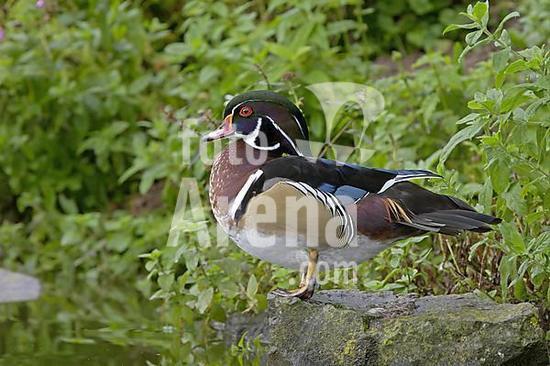 iblflp01440793 Wood Duck (Aix sponsa), adult male, standing on rock, England, United Kingdom, Europe