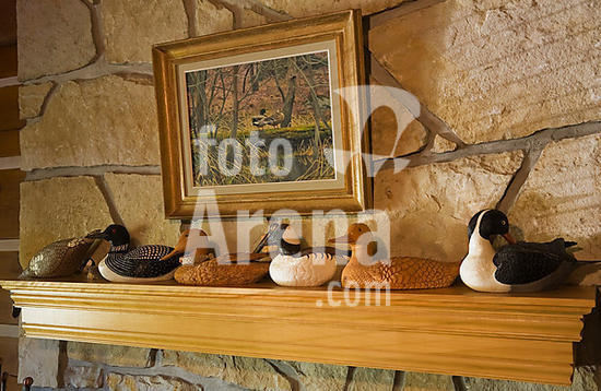 iblpmt02272062 Wooden duck and loon carvings on a fireplace mantle in the living room of a 1977 reproduction of an old Canadiana cottage-style residential log home, Quebec, Canada. This image is property released for book, calendar, magazine, newspaper and editorial use only. LUPR0168