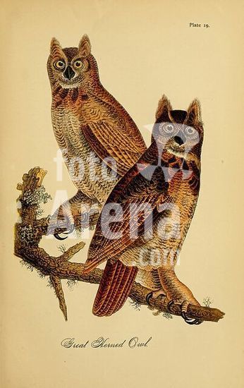 alb15271642 Report on the Birds of Pennsylvania, Harrisburg, E.K. Meyers, State Printer, 1888, birds, Pennsylvania, owl, Bubo virginianus, The illustration features two Great Horned Owls perched on a branch, showcasing their distinctive plumage. One owl is positioned slightly in front of the other, both exhibiting the characteristic tufted ears and intense gaze that these majestic birds are known for. Their rich browns and subtle ochres create a detailed texture, highlighting the intricate patterns of their feathers. The background is simple, emphasizing their striking features and natural stance, while the caption beneath identifies them as Great Horned Owls, underscoring their prominence in North American wildlife.