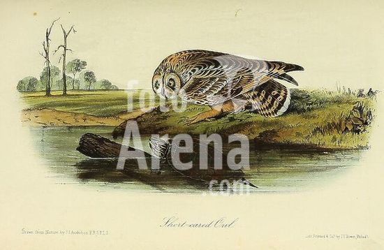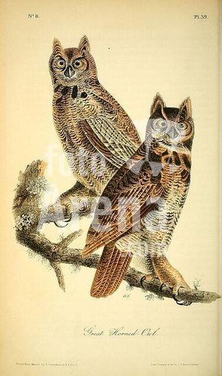 akg386761 Ornithology / Owl Great Horned Owl- Bubo virginianus. - "Great Horned Owl / Strix virginiana". (male and female). Aquatint, coloured, by Robert Havell t. Y. (1793-1878) after a drawing by John J.Audubon. (1780-1851).From: J.J.Audubon, The Birds of America, London, 1827-38, plate 61. Paris, Natural History Museum. Museum: Paris, Natural History Museum. Author: Robert Havell. John James Audubon.