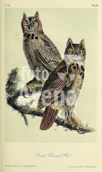 alb4396194 Great-Horned Owl, Great Horned Owl (Bubo virginianus), Signed: J.J. Audubon, J.T. Bowen, lithograph, Pl. 39 (vol. 1), Audubon, John James (drawn); Bowen, J. T. (lith.), 1856, John James Audubon: The birds of America: from drawings made in the United States and their territories. New York: Audubon, 1856.