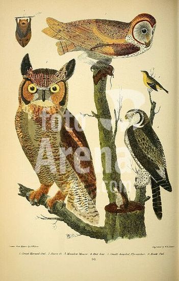 alb15279352 American ornithology, or The natural history of the birds of the United States, Petter & Galpin [187-]. Birds, United States, Owl, Bubo virginianus, Great horned owl, Chiroptera, Surnia ulula, Barn owl, Northern hawk owl, Microtus pennsylvanicus, Lasiurus borealis, Taxonomy: binomial = Tyto alba, Eastern red bat, Meadow vole, This illustration features a collection of various bird species perched on branches, showcasing intricate details of their plumage and anatomy. The central figure is a Great Horned Owl, notable for its distinctive tufts and striking facial features. To the right, a Barn Owl displays its unique heart-shaped face, while below a Small-Banded Flycatcher is depicted in mid-perch. Additionally, a Northern Flicker can be seen, highlighting its characteristic markings. Each bird is presented with careful attention to detail, capturing the beauty and diversity of avian life.