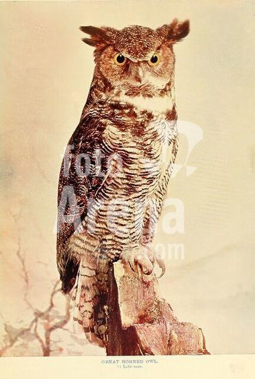alb15370921 Birds and nature in natural colors, Chicago, A.W. Mumford, Publisher, 1913-1914, birds, North America, Bubo virginianus,, A great horned owl perches majestically on a rustic branch, showcasing its distinctive tufted ears and piercing yellow eyes. The owl's feathers exhibit a striking pattern of browns and whites, blending seamlessly with its natural environment. Its strong, formidable presence is accentuated by the surrounding soft backdrop, emphasizing the owl's status as a skilled predator. This iconic species is known for its adaptability and widespread range, making it one of the most recognized owls across various habitats. The branch adds a touch of nature, further enhancing the portrayal of this magnificent bird.