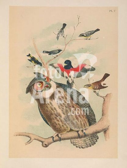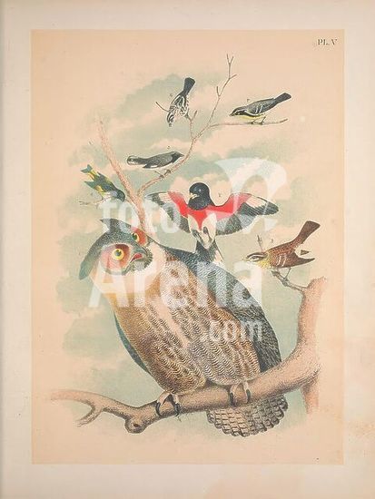 alb15324863 The birds of North America New York, U.S.A, 1895, c1888. birds North America pictorial works great horned owl Bubo virginianus rose-breasted grosbeak Coccothraustes ludovicianus American redstart Setophaga ruticilla black-throated blue warbler Dendroica canadensis black-and-white creeper yellow-throated warbler Mniotilta varia Dendroica superciliosa Pheucticus ludovicianus Setophaga caerulescens Mniotilta varia Setophaga dominica, A majestic owl perches prominently on a branch, its striking features highlighted by vibrant colors. Surrounding the owl are various smaller birds, each depicted in mid-flight or perched nearby, showcasing a range of colors and patterns. The background hints at a serene sky, adding a tranquil atmosphere to the scene. This composition beautifully illustrates the diversity of avian life, with each bird exhibiting unique characteristics and a sense of movement, creating a harmonious blend of nature.