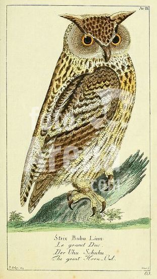 alb15337688 Gemeinnützige Naturgeschichte des Thierreichs bd 2 plates Berlin, bei Gottlieb August Lange, 1780-1789. zoology Eurasian eagle owl horned owl eagle owl ornithology bird birds Old World birds European eagle owl owl true owl Bubo bubo, The illustration features a great horned owl perched on a branch, showcasing its distinctive tufts resembling horns. Its large, expressive eyes are highlighted by a striking contrast with the surrounding plumage, which displays a beautiful pattern of browns and creams. The owl's face displays a formidable gaze, with a sharp beak beneath its prominent forehead. The branch upon which it rests adds a natural element to the composition, completing the detailed depiction of this majestic bird. The title, indicating its species name and various languages, suggests an emphasis on the owl's recognition across different cultures.