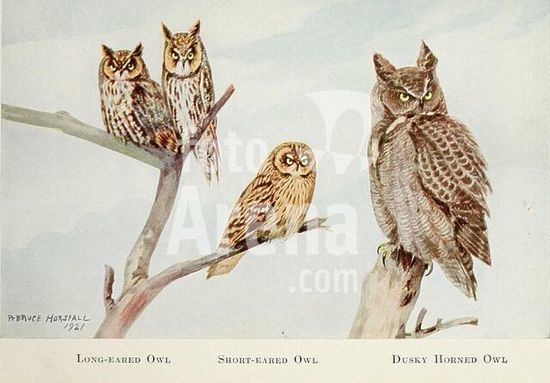 alb15339132 Birds of the Pacific Coast New York G. P. Putnam's Sons 1923 birds British Columbia Bubo virginianus Great Horned Owl Asio otus Asio flammeus Long-eared Owl 598279 Pacific Coast North America Short-eared Owl, A collection of four distinct owl species perched on branches, each illustrated with attention to detail. From left to right, the Long-eared Owl stands tall with its characteristic tufts, followed by the smaller Short-eared Owl, notable for its rounded face and subtle markings. Next is the Dusky Horned Owl, showcasing its striking features and intense gaze. Each owl is set against a softly rendered background that complements their unique colors and patterns, creating a harmonious scene in nature. Below the owls, their names are elegantly displayed, providing clear identification of each species.