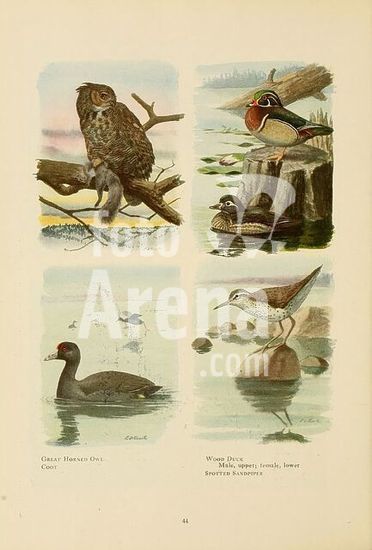 alb15384617 The book of birds, Common birds of town and country, American game birds, Washington, D.C, 1918, birds, The illustration features a detailed depiction of various bird species in their natural habitats. In the upper left corner, a Great Horned Owl perches majestically on a branch, showcasing its distinctive tufted ears and attentive gaze. Adjacent to it, the vividly colored Wood Duck stands out, perched on a log, displaying its iridescent plumage and unique facial markings. The lower left section illustrates a Coot, swimming gracefully on the water, characterized by its rounded body and distinct white bill. Finally, the lower right corner captures a Spotted Sandpiper, poised on a rock by the water's edge, highlighting its slender form and spotted pattern.