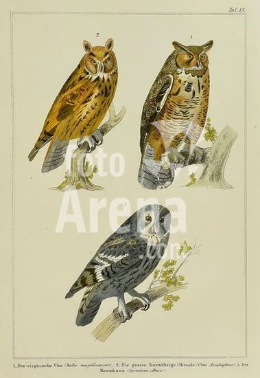 alb15389517 Praktische Naturgeschichte der Vögel, Leipzig, 1850, Birds, Pictorial Works, A detailed illustration featuring three distinct owl species perched on tree branches. The first owl, on the left, displays rich brown and orange plumage with intricate patterns, likely representing the Virginia owl. The middle owl exhibits a striking combination of earthy tones, showcasing its powerful build and large size, which might indicate it is the Great Horned Owl. The final owl on the right is characterized by a softer gray and white color palette, adorned with delicate markings, suggesting it is the Boreal Owl. Each owl is depicted with attention to detail, showcasing their unique features and natural habitat elements.