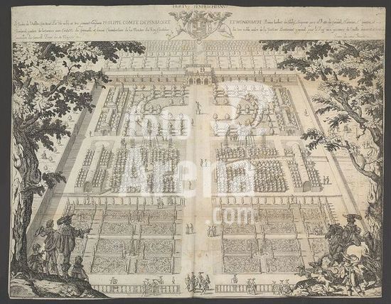 alb3674495 Wilton Garden, plate 1. Designer: Isaac de Caus (British (born France), Dieppe 1590-after 1655). Dimensions: Sheet (unfolded): 16 1/8 × 20 9/16 in. (41 × 52.3 cm). Etcher: Peter Stent (British, active ca. 1615/17-1665). Published in: London. Publisher: Thomas Rowlett (London). Date: ca. 1640.The garden of Wilton House (Wiltshire), famous today for its eighteenth-century landscape design containing England's first Palladian bridge, was originally laid out in the mid-1630s by the French-born Isaac de Caus (active 1623-55). It was commissioned by Philip Herbert, fourth earl of Pembroke, pivotal figure of the intellectual circles at court, to which the architect Inigo Jones (1573-1652) belonged. Recognized for having brought the classical style to England, Jones may well have been involved in Wilton's building campaign, given its Italianate components. In this plate, De Caus's garden view, framed by onlookers in the foreground, provides an elevated prospect of the entire geometric layout, stretching from the north, across the full length of the building facade, toward a balustraded grotto at the southern end. The strictly enclosed, rectangular layout consists of three main parts symmetrically aligned around a broad central axis. Starting with a compartment of parterres de broderie nearest the house, the middle section contains a wooded area or wilderness, usually placed at the end but in this case situated so as to hide the irregular flow of the River Nadder. The large hippodrome-shaped section comprising the third part of the garden is inspired by Greco-Roman architecture. The statues and waterworks, executed by Nicholas Stone, also follow classical Italian precepts. Museum: Metropolitan Museum of Art, New York, USA.