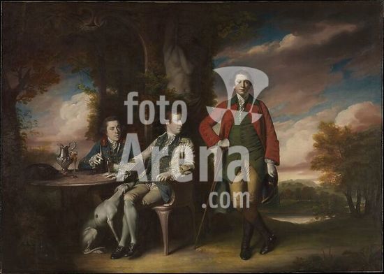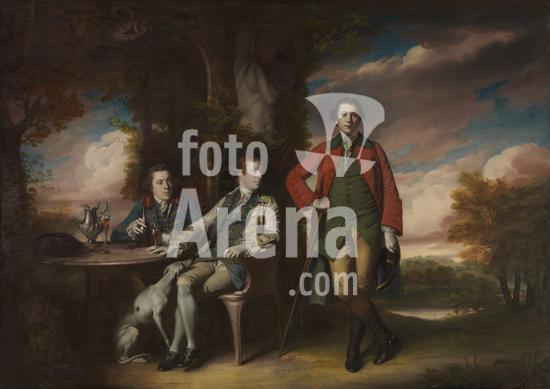 alb3684040 The Honorable Henry Fane (1739-1802) with Inigo Jones and Charles Blair. Artist: Sir Joshua Reynolds (British, Plympton 1723-1792 London). Dimensions: 100 1/4 x 142 in. (254.6 x 360.7 cm). Date: 1761-66.Seated at the center with his greyhound is the Honorable Henry Fane, second son of the eighth earl of Westmorland. To the left is Inigo Jones, a relative of the celebrated architect, and to the right Charles Blair, Fane's brother-in-law. Although shown in a landscape, each of the three men would have sat for Reynolds separately, in his studio. Reynolds's largest and most impressive conversation piece, this canvas was begun in 1761 and completed in 1766. Museum: Metropolitan Museum of Art, New York, USA.