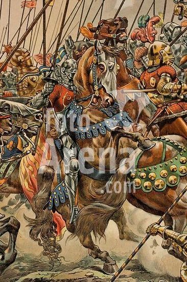 akg1947629 Schweiz / Schlacht bei Murten am 22.Juni 1476 (Sieg der Schweizer Eidgenossen über Herzog Karl den Kühnen von Burgund).-Die Schlacht bei Murten.-( Ausschnitt). Farblithographie nach Aquarell von Job, d.i.Jacques Onfroy de Breville (1858-1931). Aus: Job et G.Montorgeuil, Louis XI, Paris (Combet Cie) 1905, S.47/48.