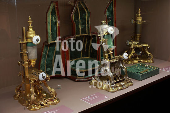 akg4908122 Ausstellung / Wissenschaftsausstellung. - Ausstellung "Sciences et curiosités à la cour de Versailles", Versailles (Département Yvelines, Frankreich), Schloss / Château de Versailles, Salles d'Afrique et de Crimée, 26. Oktober 2010 bis 27. Februar 2011. Exponate im Saal 6 "Versailles, lieu de pratiques princières des sciences et des techniques": Drei Mikroskope; in der Mitte Mikroskop, 1751, von Alexis Magny (1712 - um 1777). (Geschenk des Königs Ludwig XV. von Frankreich an König Stanislaus I. Leszczynski. Bronze, Fischhaut, Spiegel, Glas und Email, Höhe 42 cm, Breite 24,5 cm. Leihgabe des Lycée Poincaré in Nancy, Inv D. III 924. Nancy, Musée historique lorrain). - Foto, 25. Oktober 2010.