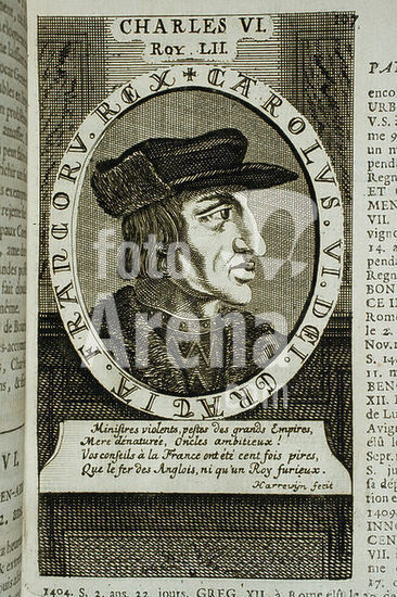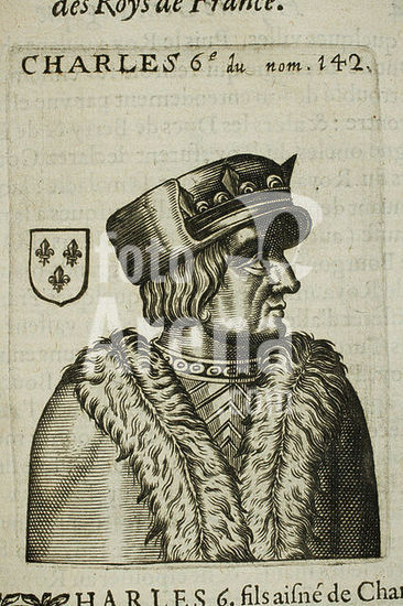 akg5822952 Charles VI, the Mad (Charles VI le Fou), King of France (1380-1422); Paris 3. 12. 1368 - ibid 21. 10. 1422. - "CHARLES 6 du nom". - No. 142 from a portrait series of a partly mythical genealogical tree of the kings of France, starting with the biblical forefather Adam and ending with King Louis XIII. Copper engraving, anonymous. From: Thomas Blaise (1578-1654), Histoire généalogique des Roys de France depuis la création du monde jusques à présent, enrichie de leurs portraits (...), Le tout extraicte de l'histoire Universelle de Jacques de Charron, Paris (Thomas Blaise) 1630. Private collection.