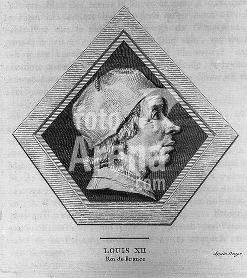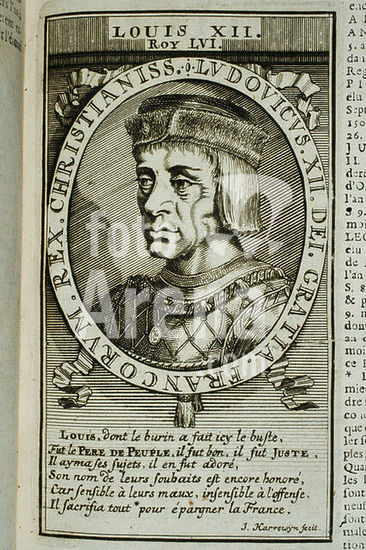 akg5822787 Louis XII, Father of the People (Louis XII le Père du peuple), King of France (1498-1515); Blois 27. 6. 1462 - Paris 1. 1. 1515. - "LOUIS XII. / ROY LVI." - 56th King from a series of portraits of the kings of France from Pharamond to Louis XIV. Copper engraving by Jacobus Harrewijn (1660-1727). From: François Eudes de Mezeray (1610-1683), Abrégé chronologique de l'Histoire de France, Amsterdam (Antoine Schelte) 1700. Private collection.